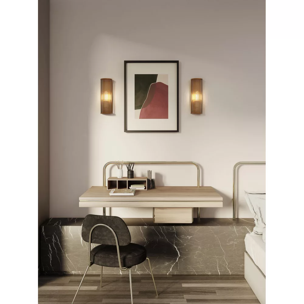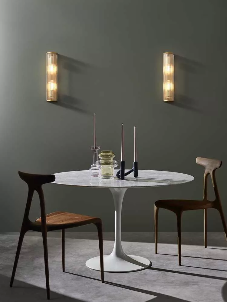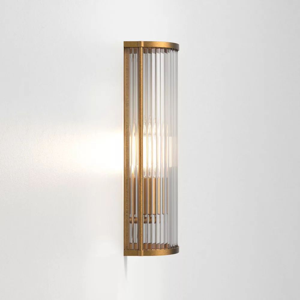 Inspired by Art Deco fixtures, the Avignon Round 525 wall lamp is large-scale and lends immediate drama and presence to the space. Tall and slim, with a rounded profile, sparkling clear glass rods, die-cast antique brass end caps, and emits ambient, non-glare lighting. The lamp designed for hospitality can be attached to the wall with a single discreet screw, so nothing distracts from the seamless appearance.