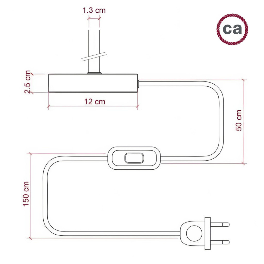 Round Creative-Cables cable with fabric cover: 2 meters (150 cm from socket to switch + 50 cm from switch to Alzaluce) 2x0.75, HAR certified. Made in Italy.