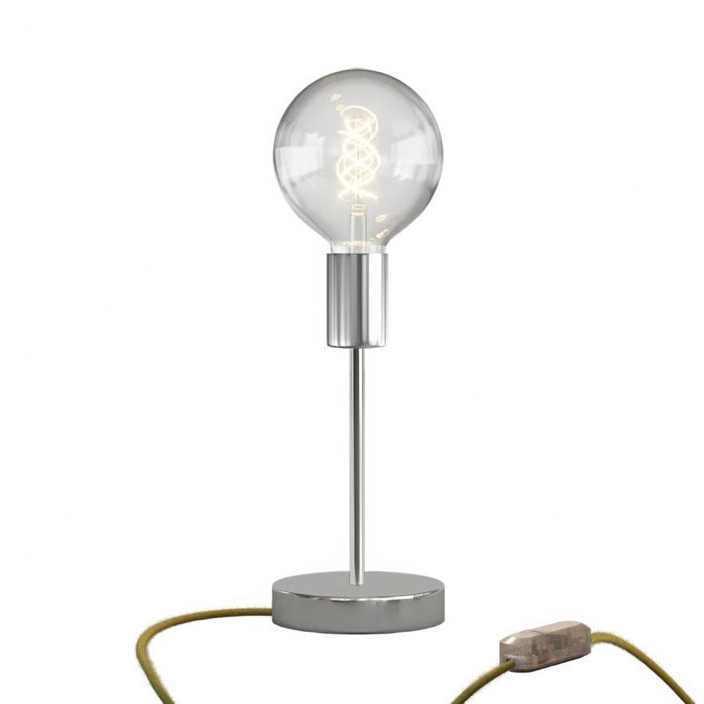Metal cap and E27 smooth lamp socket. 2.5 A EU two-pole plug / UK plug. Round Creative-Cables cable with fabric cover: 2 meters (150 cm from socket to switch + 50 cm from switch to Alzaluce) 2x0.75, HAR certified. Made in Italy. Cable/surface pairing: ERM38/Opaque Black; RN23/Brushed Chrome; RN06/Satin Bronze.