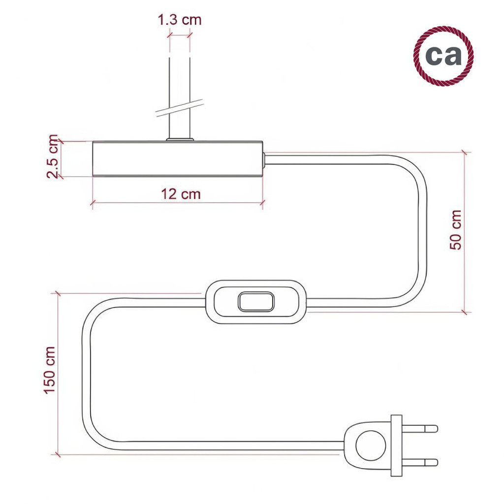 Metal cap and E27 smooth lamp socket. 2.5 A EU two-pole plug / UK plug. Round Creative-Cables cable with fabric cover: 2 meters (150 cm from socket to switch + 50 cm from switch to Alzaluce) 2x0.75, HAR certified. Made in Italy. Cable/surface pairing: ERM38/Opaque Black; RN23/Brushed Chrome; RN06/Satin Bronze.