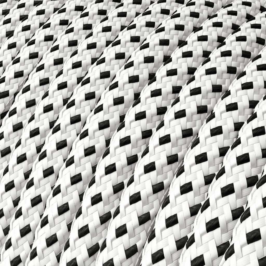 Creative-Cables fabric-covered round cable: 2 meters (150 cm from plug to switch + 50 cm from switch to Posaluce) 2 x 0.75, HAR certified. Made in Italy. Cable/surface combinations: RT14/Glossy white; RN06/Matt white; RN03/Black; RL03/Chrome; RS82/Copper; RD71/Brass; RM09/Black mother-of-pearl; RM03/Brushed titanium; ERM66/Brushed copper; ERM65/Brushed bronze