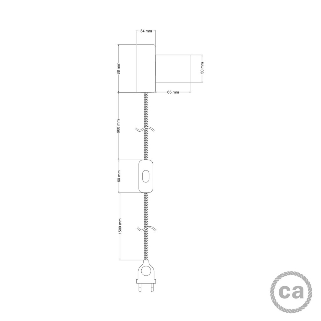 Fabric-covered cable: 210 cm (150 cm from plug to switch + 60 cm from switch to rosette) 2x0.75, made in Italy Two-pole series switch