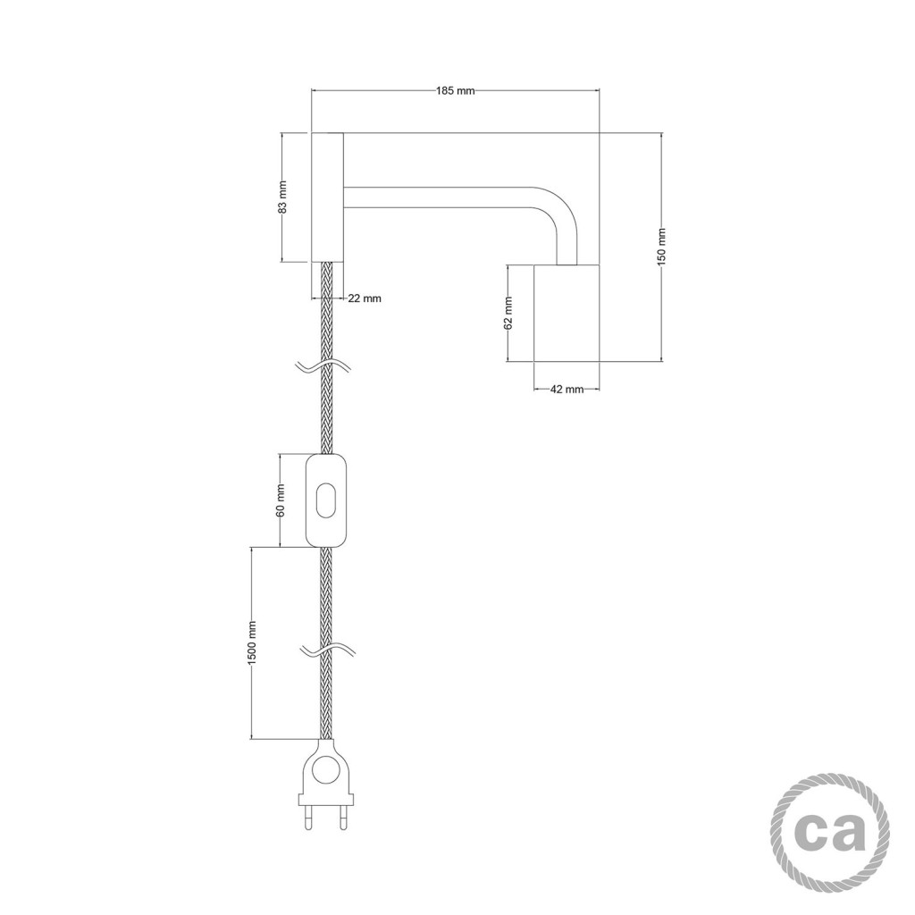 Fabric-covered cable: 210 cm (150 cm from the plug to the switch + 60 cm from the switch to the rosette) 2x0.75, made in Italy