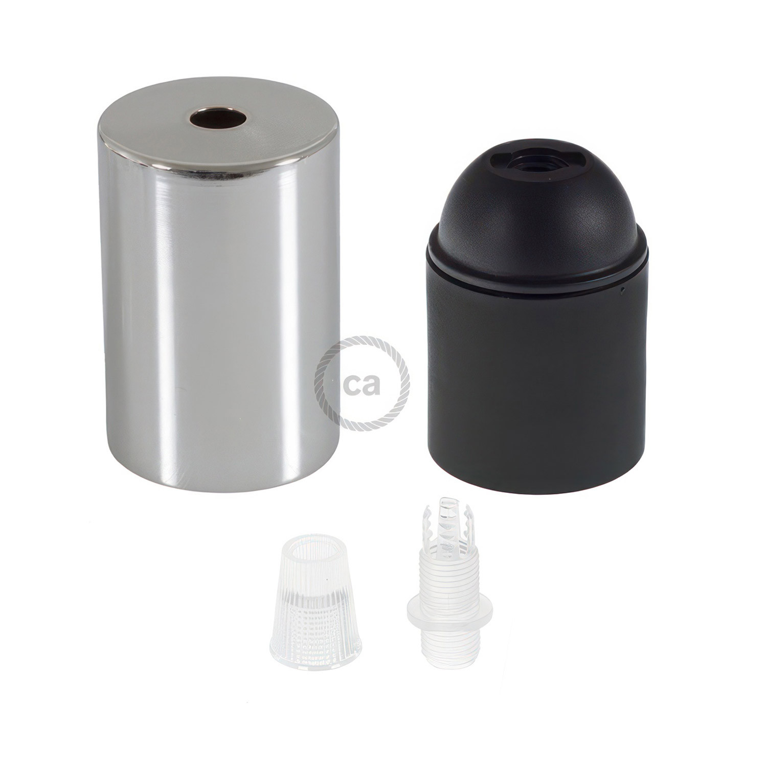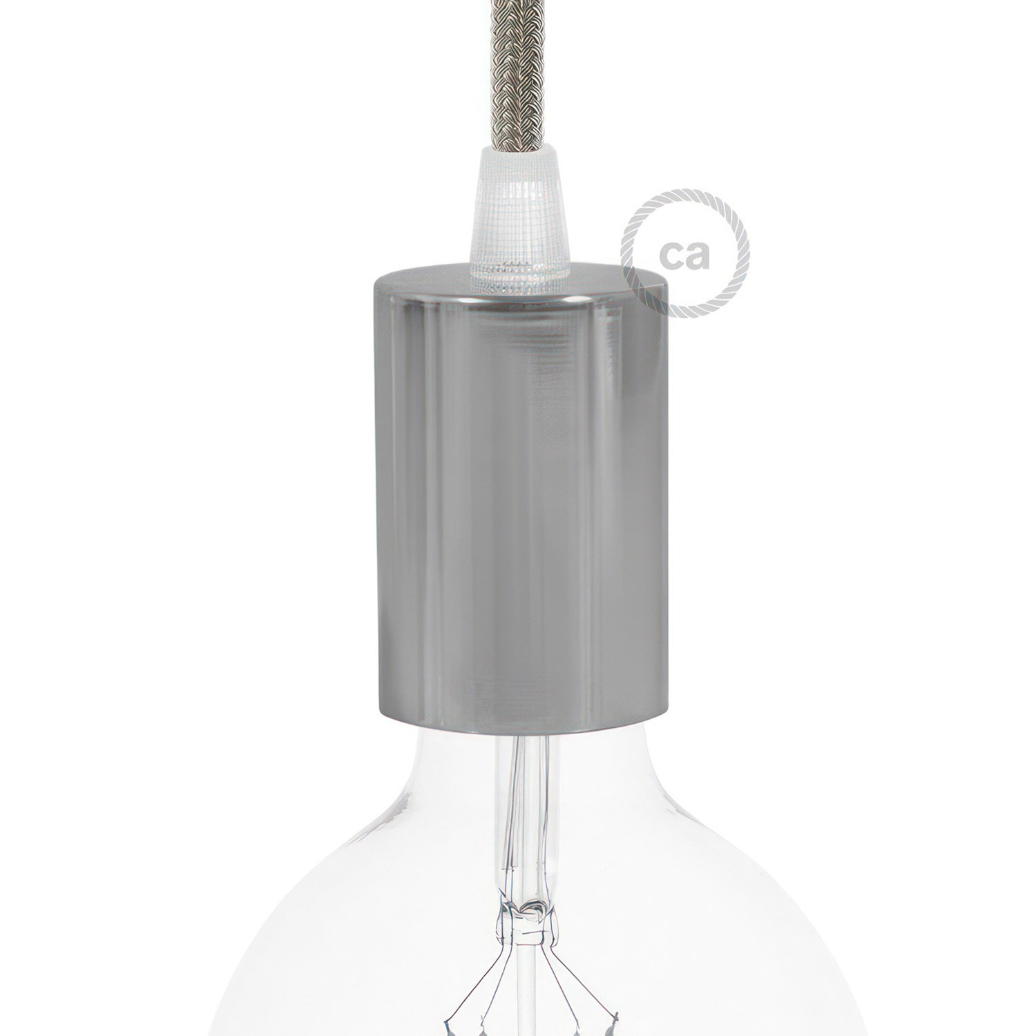 Cylindrical lamp holder set consisting of an E27 lamp holder and a cylindrical metal cable clamp, ideal for use with your favorite textile cable and ceiling rose (sold separately).