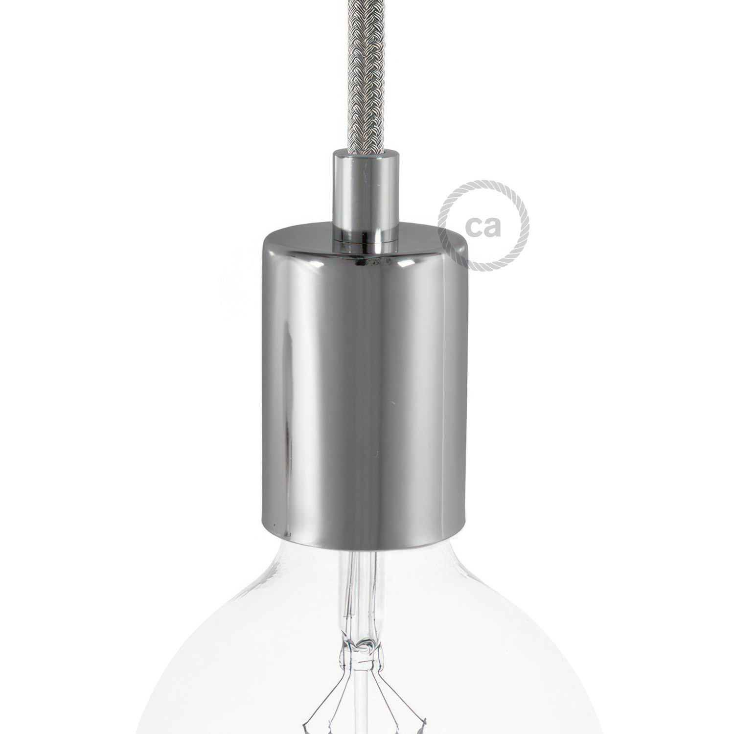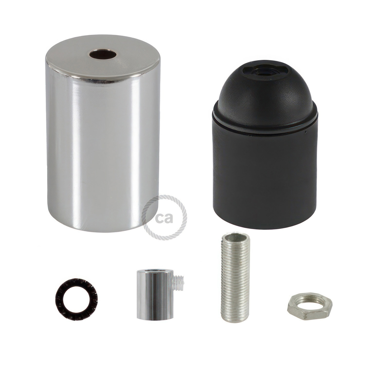 Cylindrical lamp holder set consisting of an E27 lamp holder and a cylindrical metal cable clamp, ideal for use with your favorite textile cable and ceiling rose (sold separately).