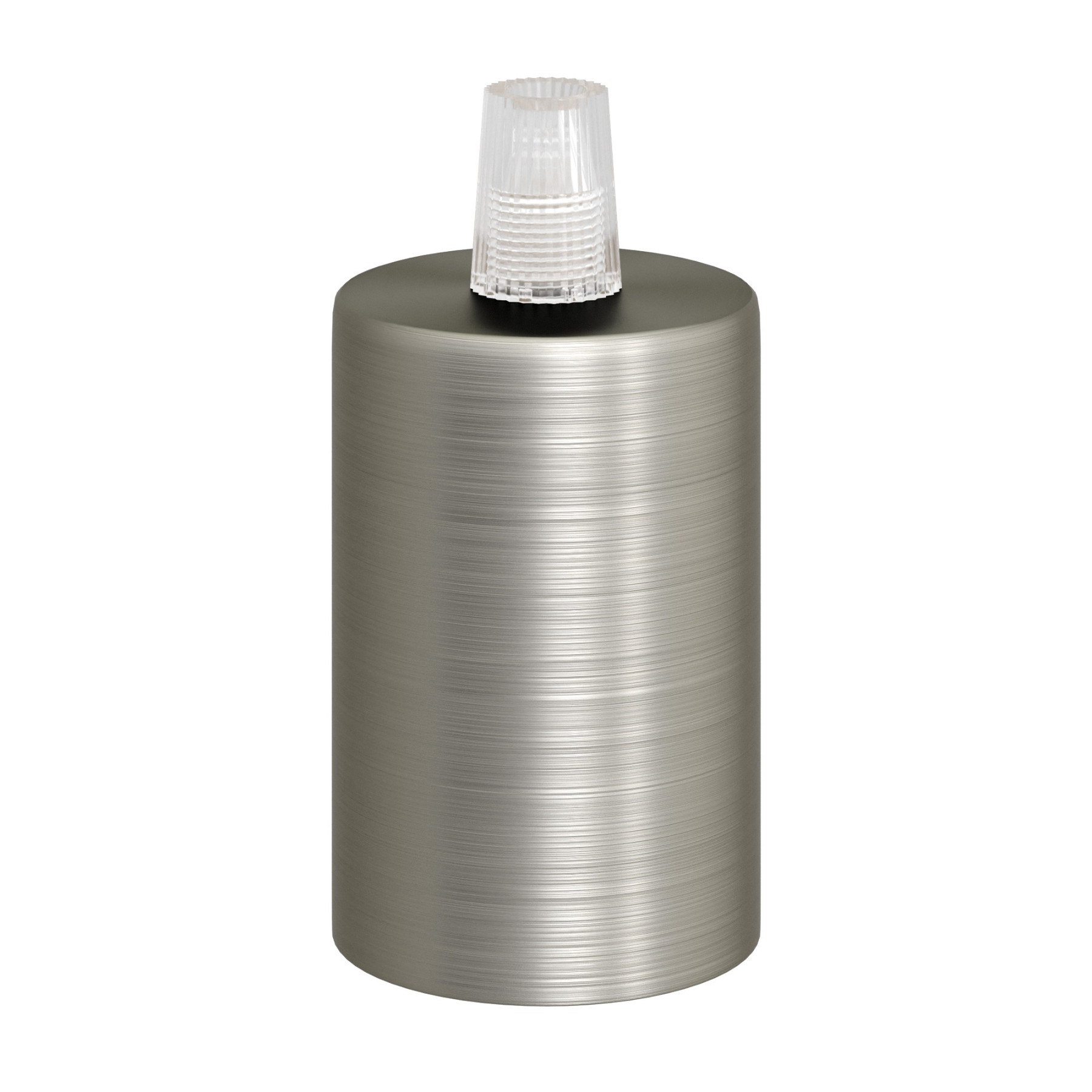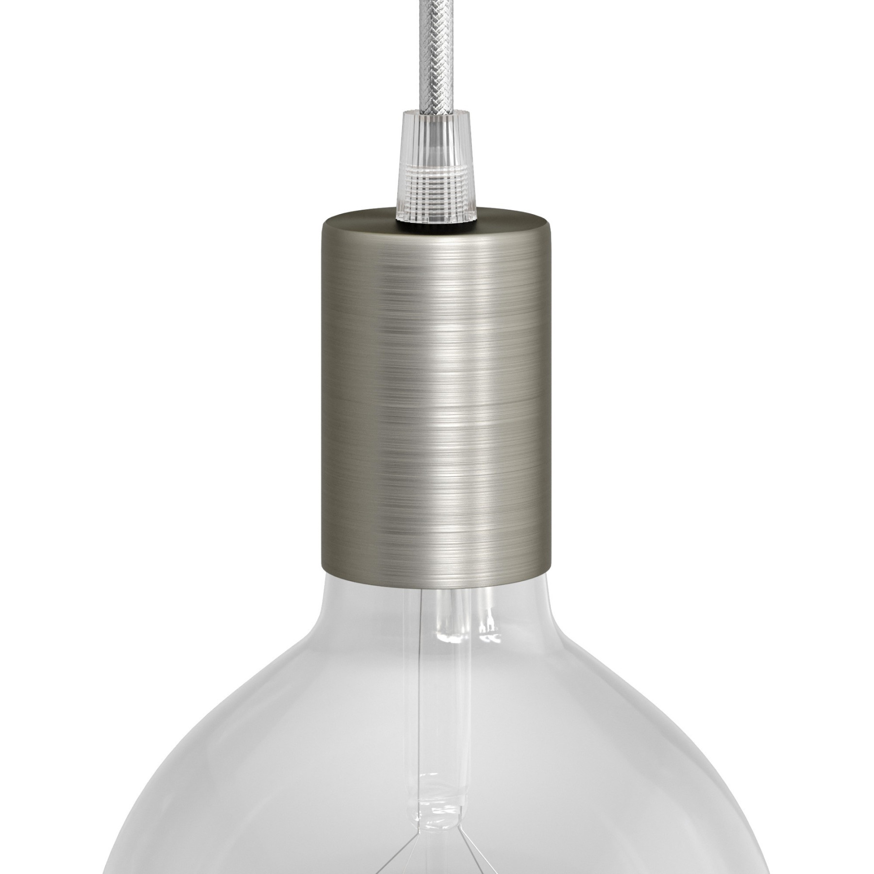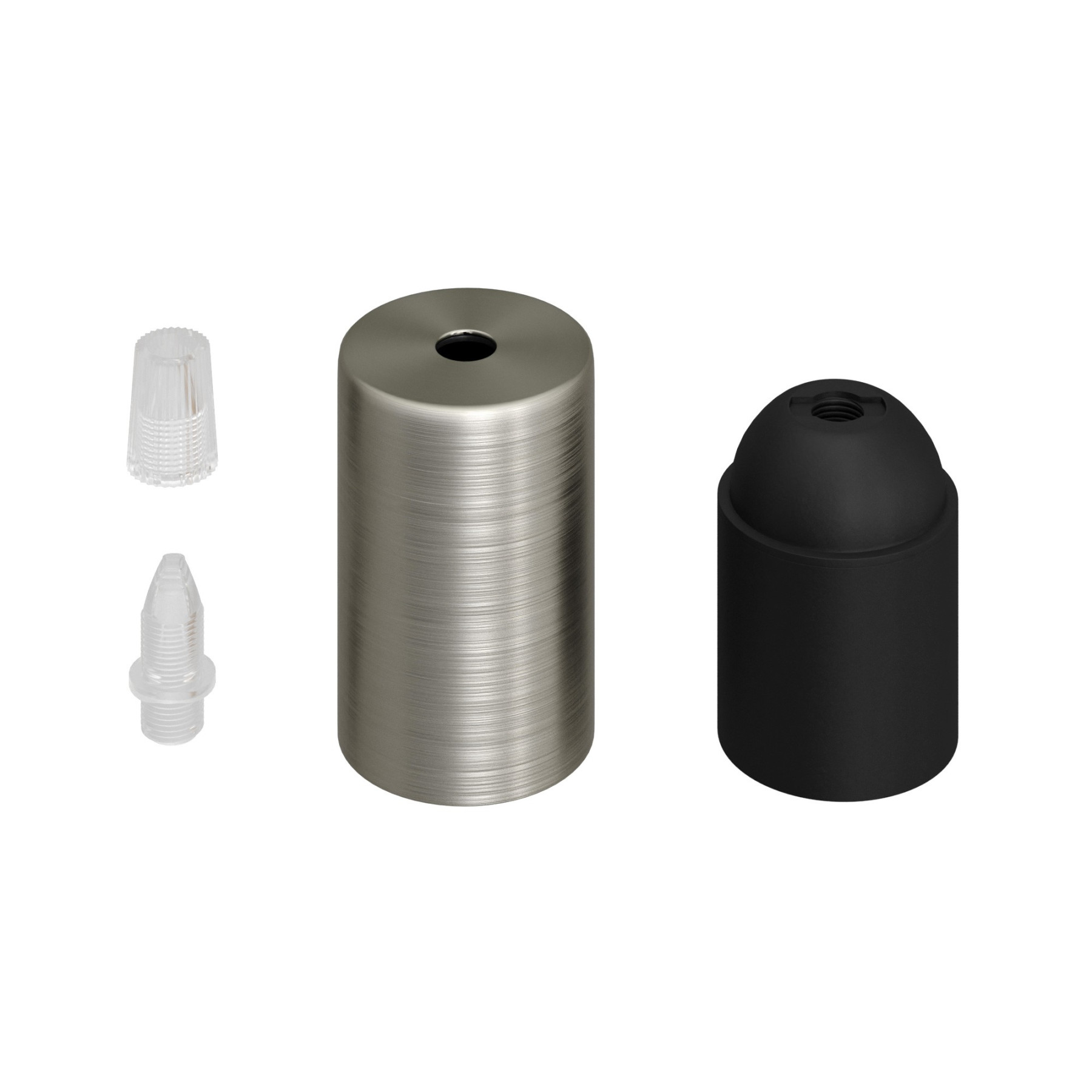 Cylindrical lamp holder set consisting of an E27 lamp holder and a cylindrical metal cable clamp, ideal for use with your favorite textile cable and ceiling rose (sold separately).