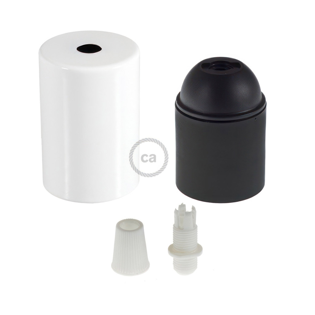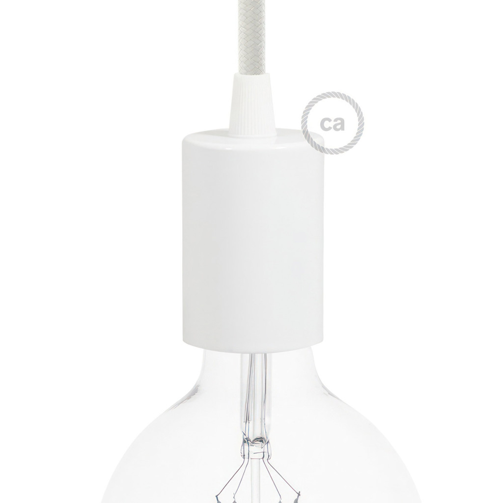 Cylindrical lamp holder set consisting of an E27 lamp holder and a cylindrical metal cable clamp, ideal for use with your favorite textile cable and ceiling rose (sold separately).