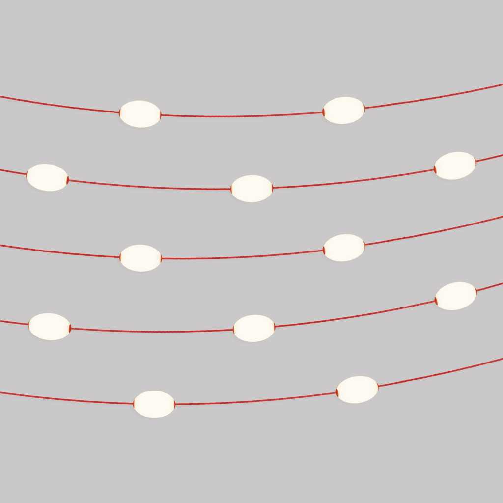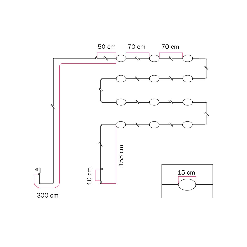 12 light points (bulbs included): LED, 12x2 W, 12x180 lm (total 2160 lm), warm light (2500 K), DC connector