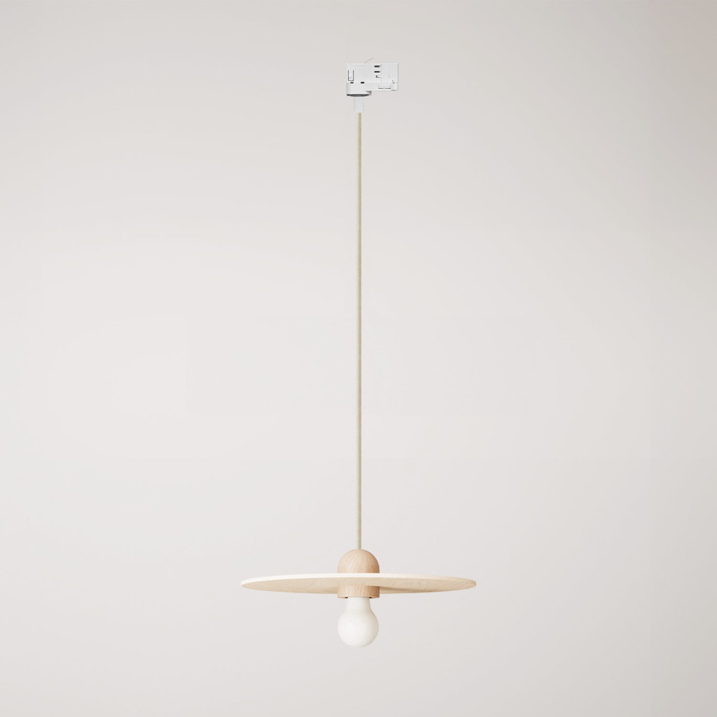 Wooden rail lamp with textile cable and UFO lampshade