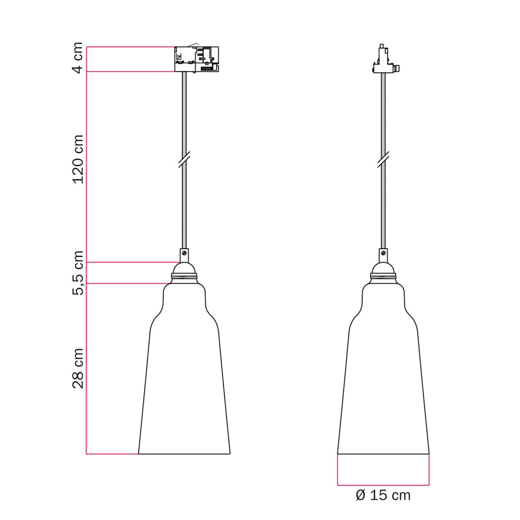 Suspended lamp Bottiglia with shade and rail adapter