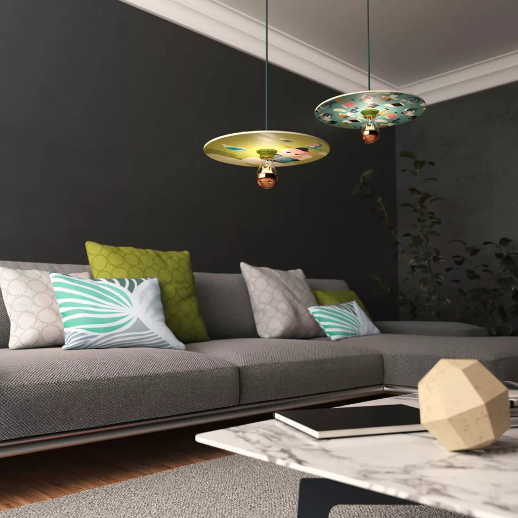 Suspended lamp with textile cable, UFO double-sided wooden lampshade and metal details - Made in Italy - Bulb included