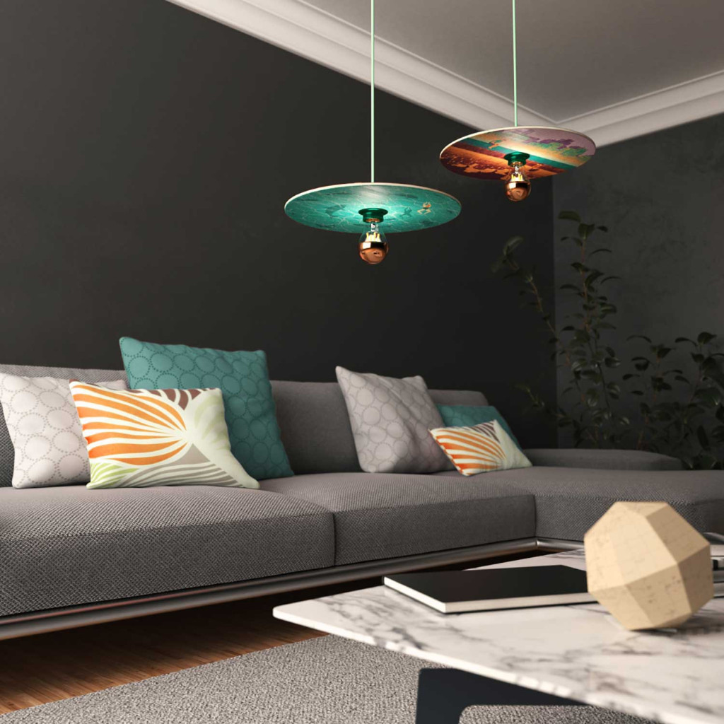 Suspended lamp with textile cable, UFO double-sided wooden lampshade and metal details - Made in Italy - Bulb included