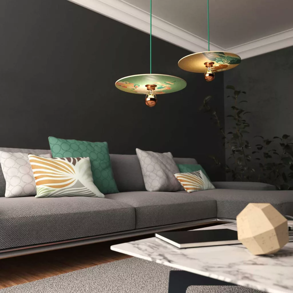 Suspended lamp with textile cable, UFO double-sided wooden lampshade and metal details - Made in Italy - Bulb included