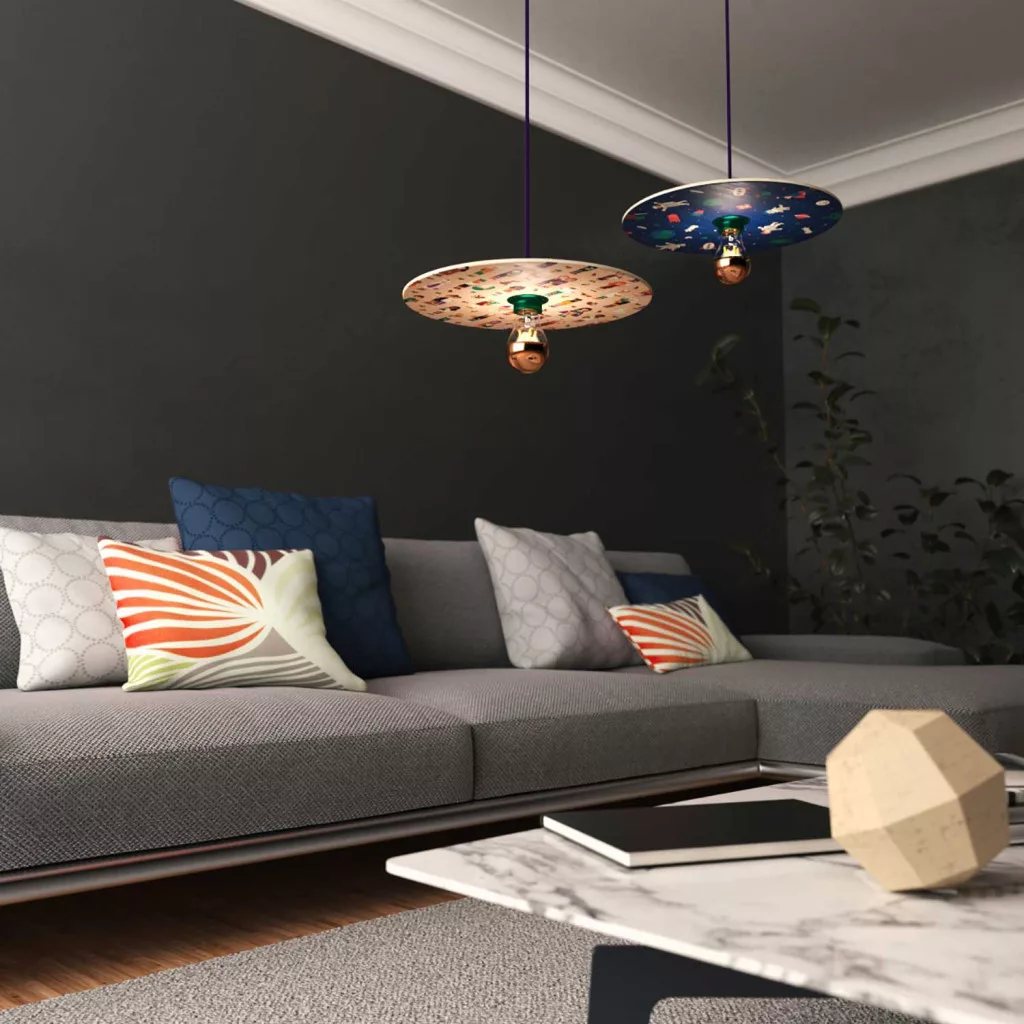 Suspended lamp with textile cable, UFO double-sided wooden lampshade and metal details - Made in Italy - Bulb included