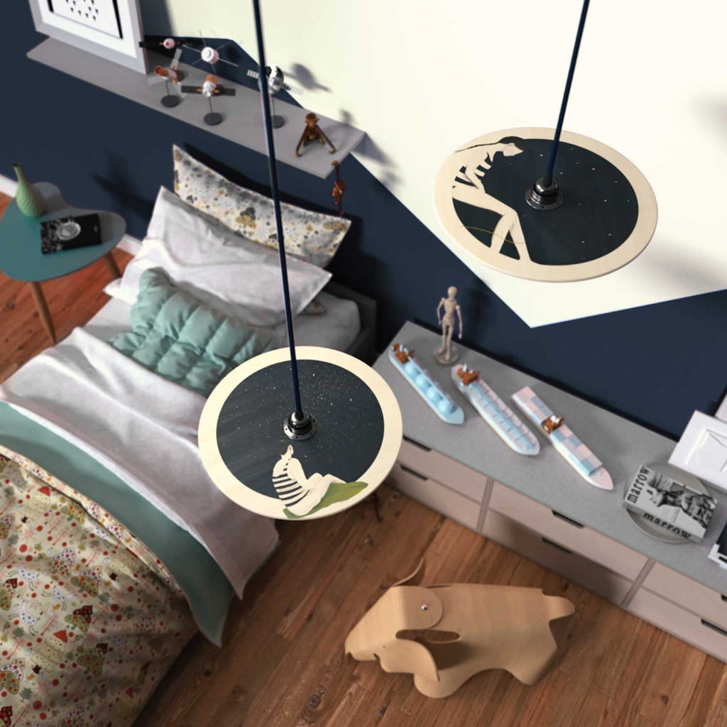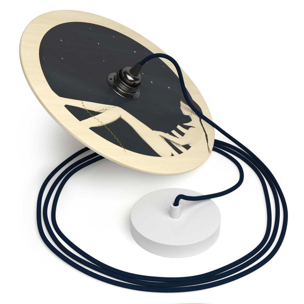Suspended lamp with textile cable, UFO double-sided wooden lampshade and metal details - Made in Italy - Bulb included