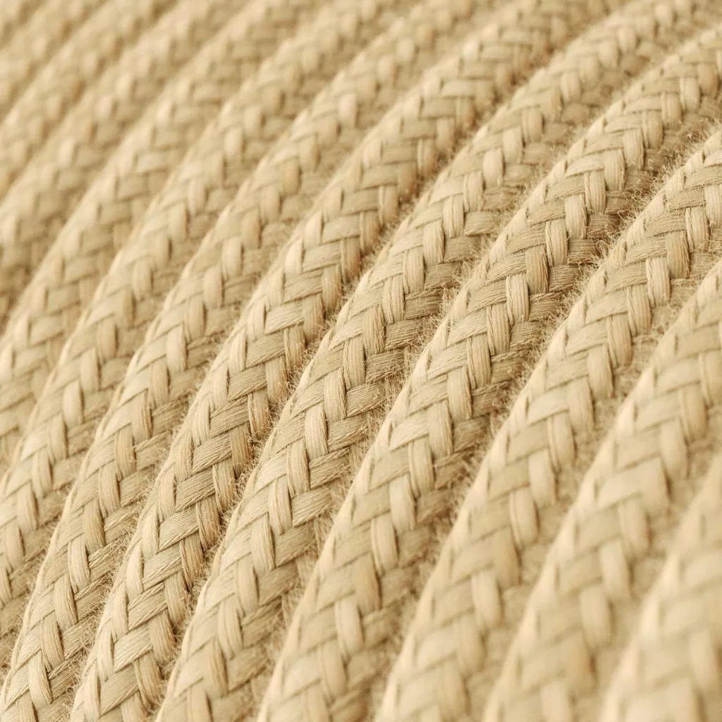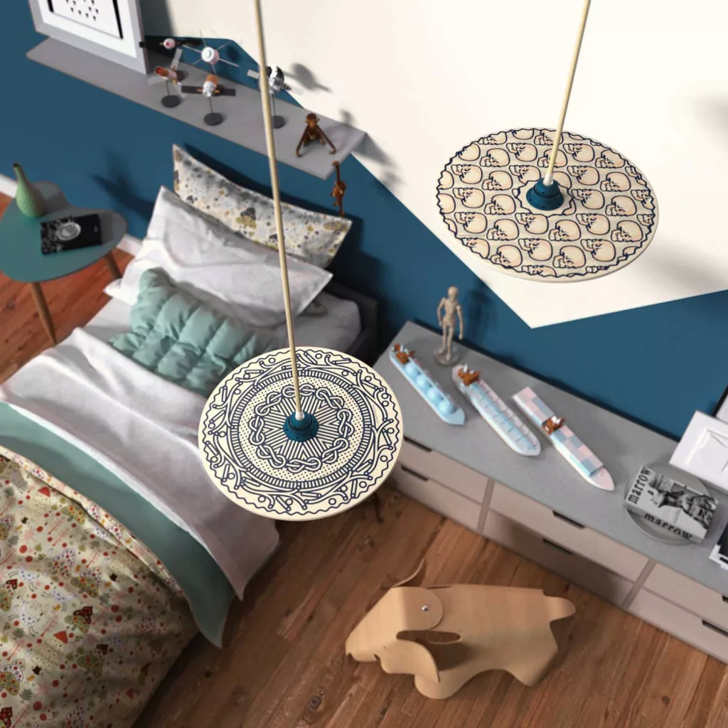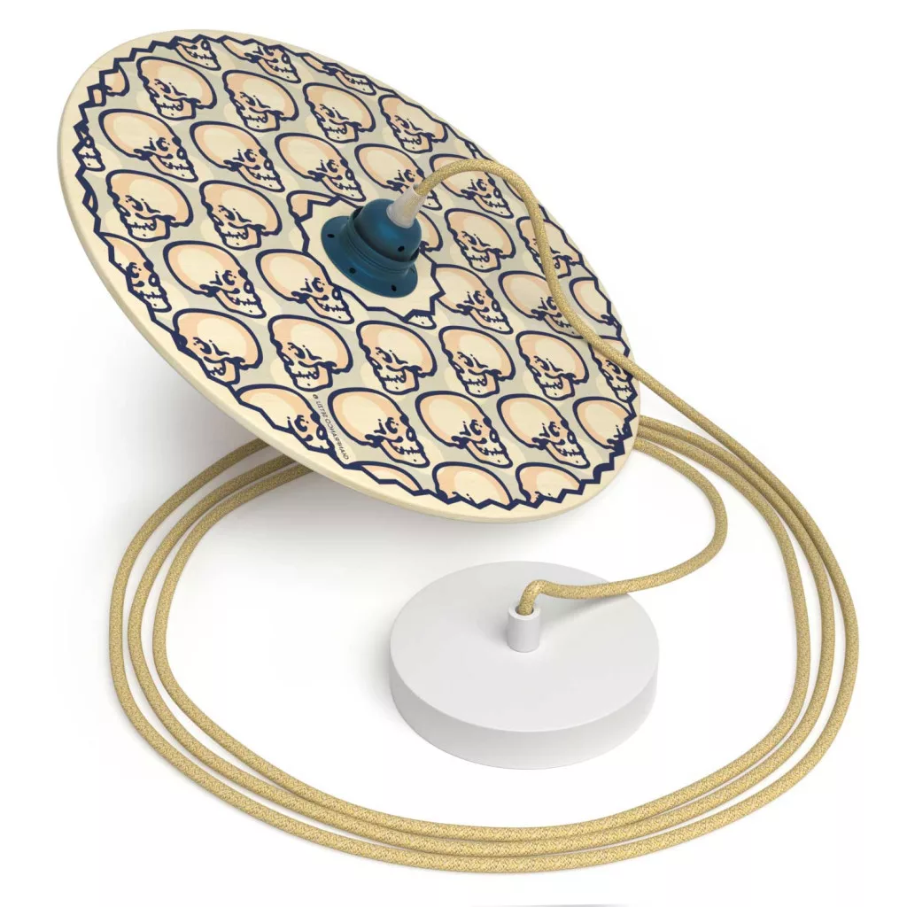 Suspended lamp with textile cable, UFO double-sided wooden lampshade and metal details - Made in Italy - Bulb included