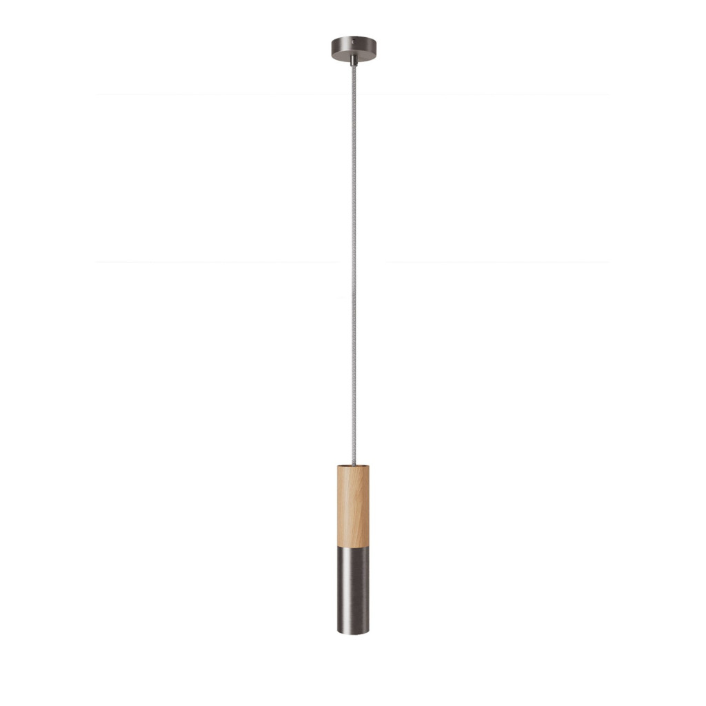 Suspended lamp with textile cable and double Tub-E14 wooden and metal shade - Made in Italy