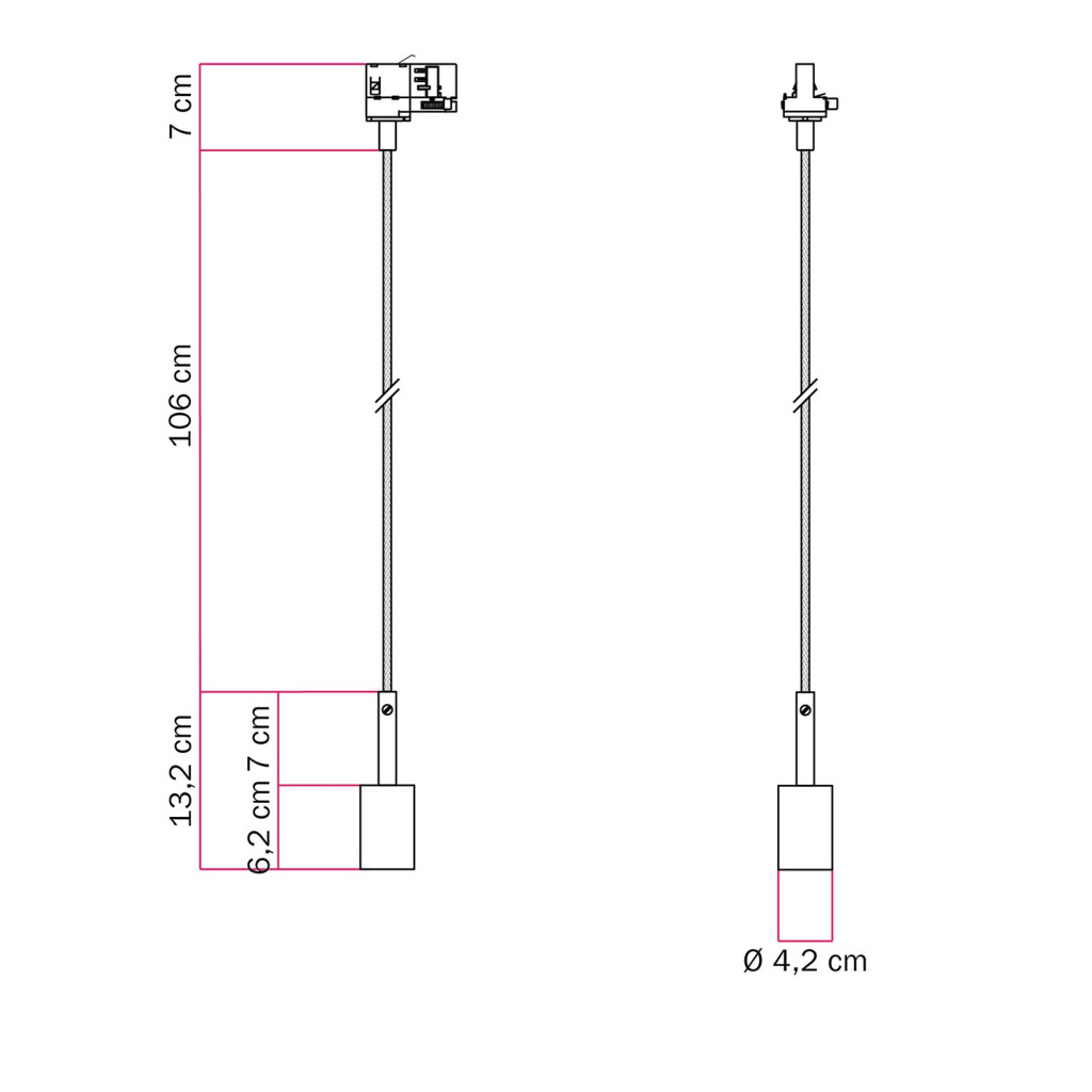 Rail-mounted pendant lamp with 7 cm cable clamp
