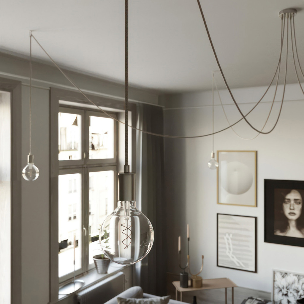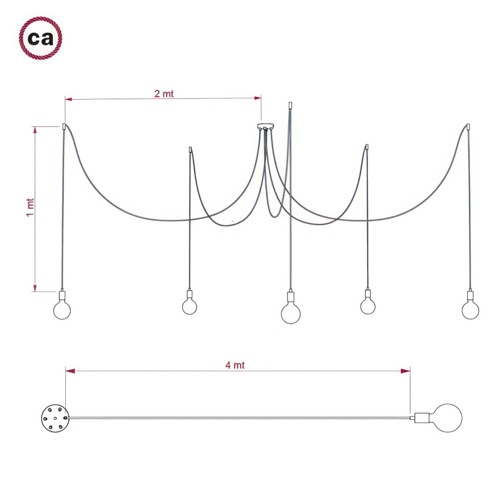 Spider - 5-light pendant lamp Made in Italy, with bulbs, fabric cables and metal cover