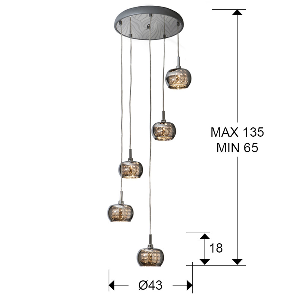 Lamp with 5 bulbs made of steel, with a shiny surface. Sparkling glass dome with crystal beads inside. The lamp comes with a remote control from the factory, which can be used to switch it on and change the brightness.