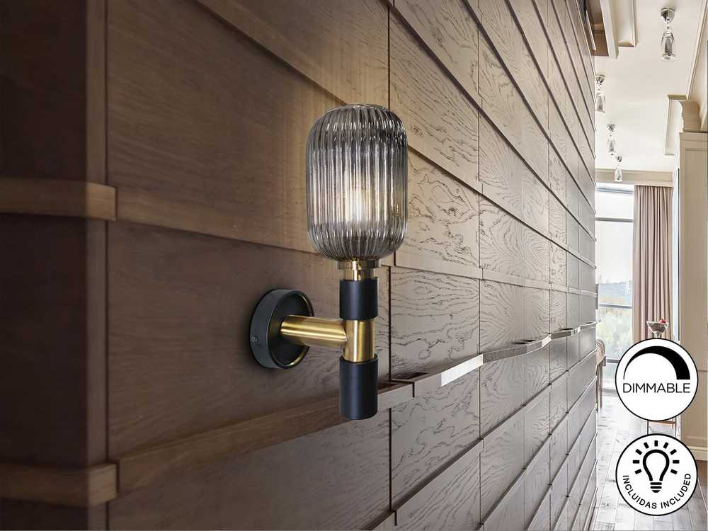 Wall lamp of 1 light made of metal, finished in matt black, with details of satin brass. Clear molded glass shade in smoke grey mirrored finish.