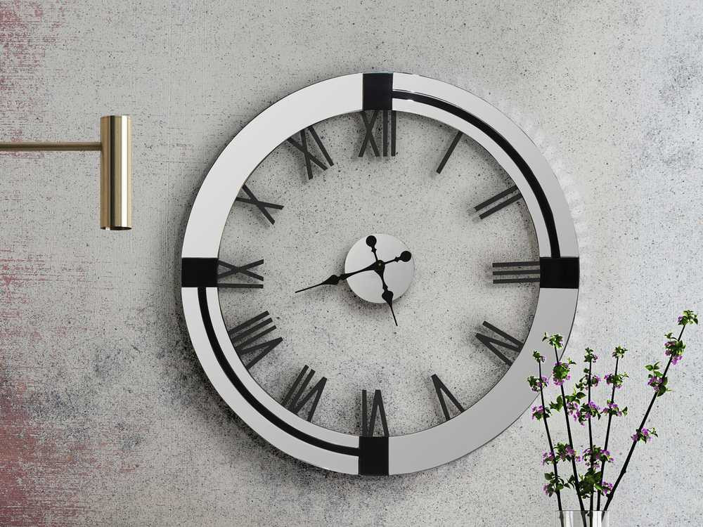 Wall clock. Sphere without background, with central structure. Slanted mirror ring on MDF lacquered base, numbers and decorative details in black. Items are not included.