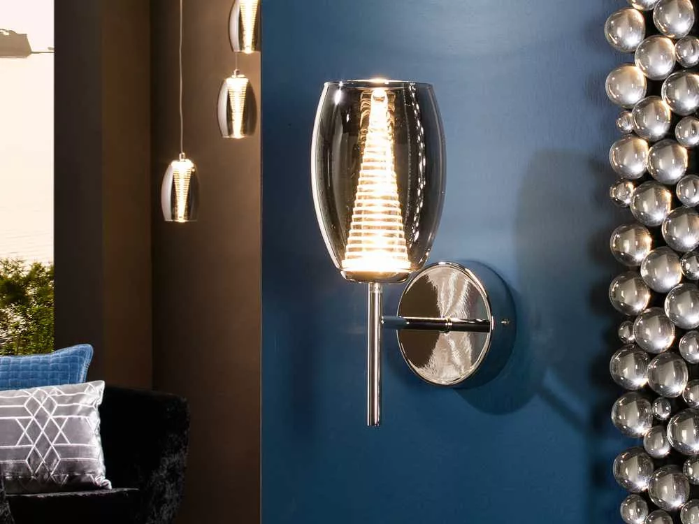 Wall lamp made of 1 LED lamp, metal, chrome design. Double umbrella, made of shiny glass on the outside, and transparent polycarbonate layered cone on the inside. 5W LED. 450 lm 3,000 K.
