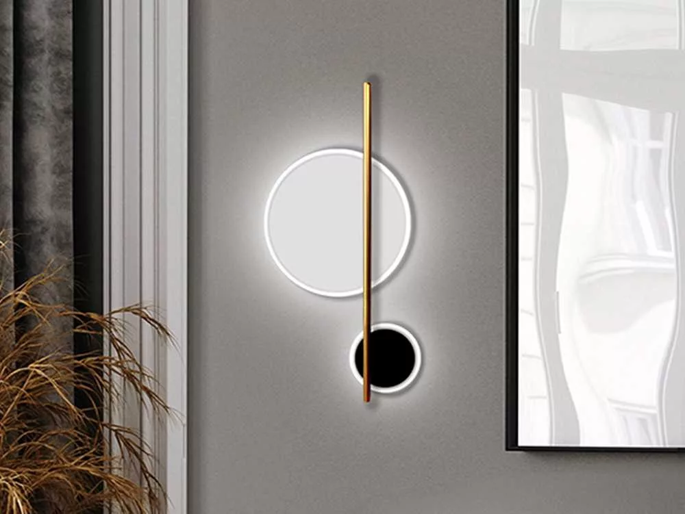 Wall lamp made of aluminum and metal; matt black, matte white and golden finish. Spheres with opal arylic diffuser. 10W LED, 1,100 lm. 3,000 K.