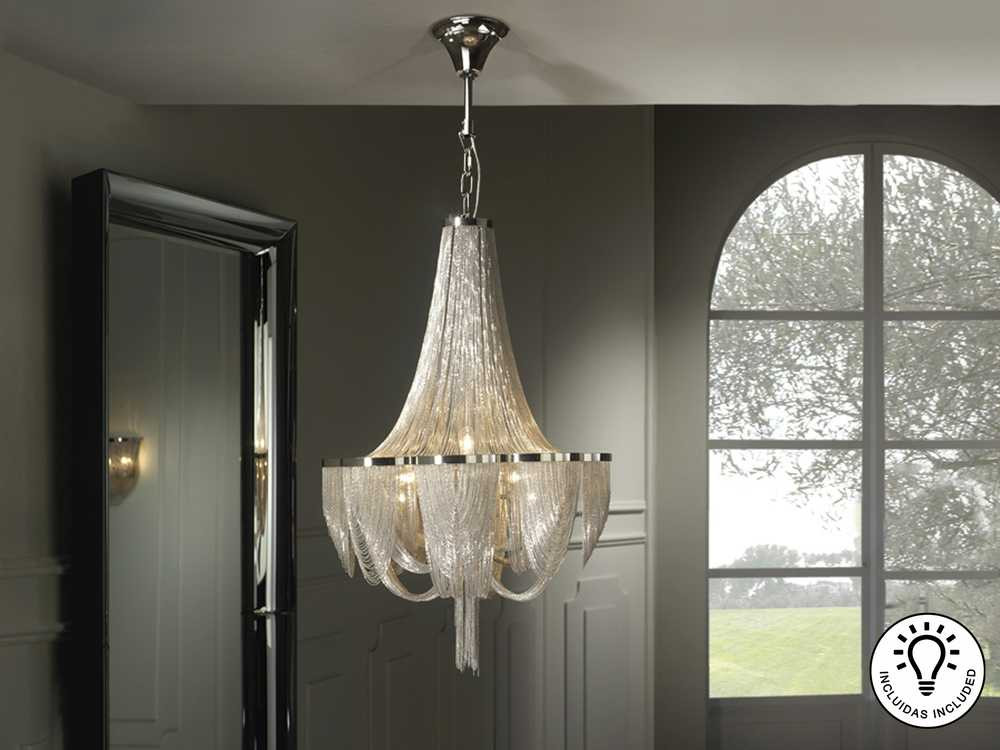 Chandelier with 10 light sources. The shape of the lamp is made up of nickel-coated fine metal chains.